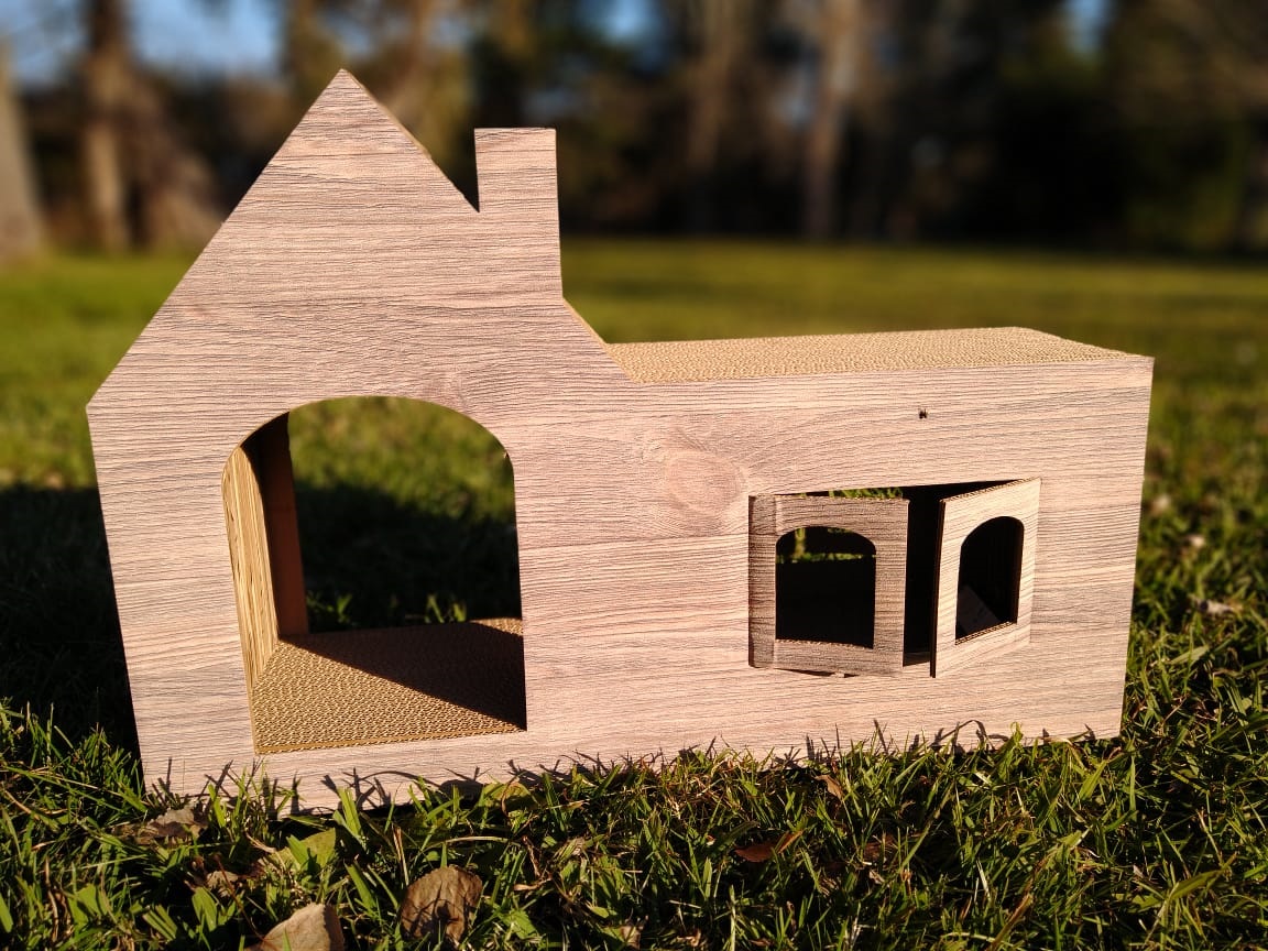 Rascador con forma de casita, ideal para que tus gatos puedan descansar y arañar a diario. Realizado en cartón triple corrugado 100% reciclado y adhesivo vegetal.